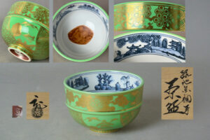 【 手塚充 緑地 金襴手 茶碗 共箱・共布付き】