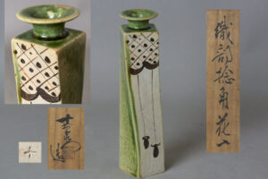 【 加藤十右衛門窯 織部 捻 角 花入 共箱付き】